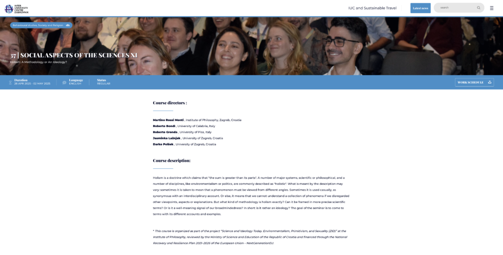 Holism: A Methodology or an Ideology?, Inter University Center (28. travnja – 2. svibnja 2025.), Dubrovnik, Hrvatska. Organiziran u sklopu projekta ZID, simpozij/ tečaj održan je kao dio serije Social Aspects of the Sciences XI.
